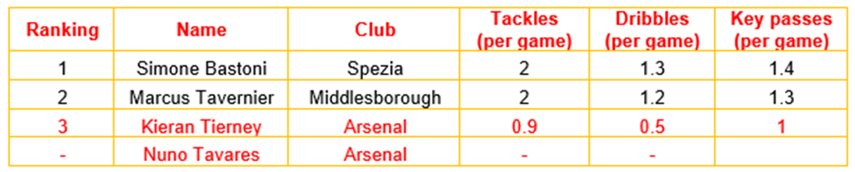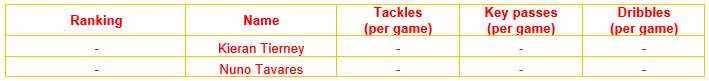 As for the club’s other contracted left wingback options, Tierney is strong in terms of key passes per game but is inadequate in terms of tackles and dribbles per game.