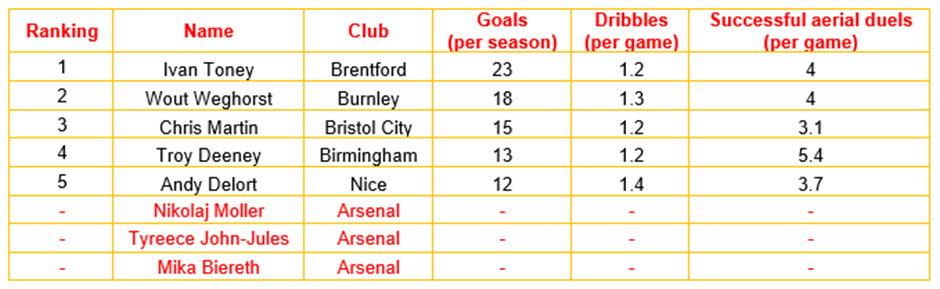 In light of the lack of experience in Arsenal’s currently contracted centre forwards, there being a number of alternative centre forward options in the considered leagues with the required KPIs, and the need for one of Arsenal’s centre forwards to be under 21 years of age, it would be logical for Arsenal to sell Moller and John-Jules, recruit Ivan Toney from Brentford, Wout Weghorst from Burnley, and retain Biereth as the club’s three centre forwards.