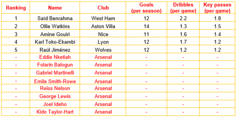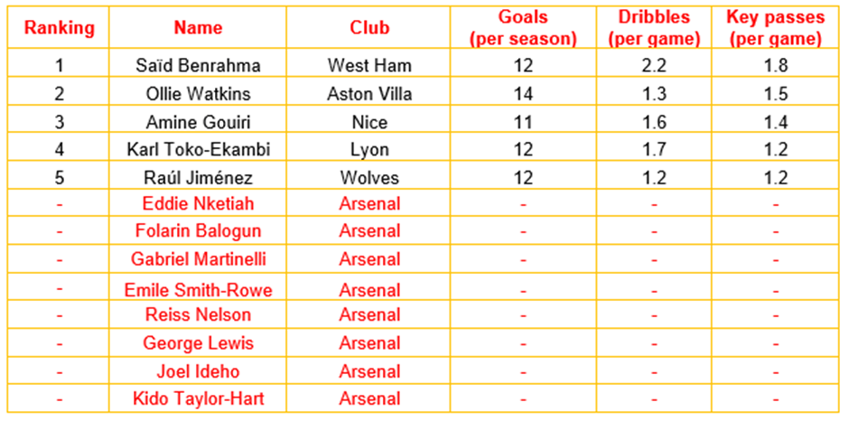 In light of the lack of experience in Arsenal’s currently contracted left forwards, Smith-Rowe’s assignment as one of the club’s attacking midfield options, there being a number of alternative left forward options in the considered leagues with the required KPIs, and the need for one of Arsenal’s left forwards to be under 21 years of age, it would be logical for Arsenal to sell Nketiah, Balogun, Taylor-Hart, Nelson, Lewis and Ideho, recruit Said Benrahma from West Ham and Ollie Watkins from Aston Villa, and retain Martinelli as the club’s three left forwards.