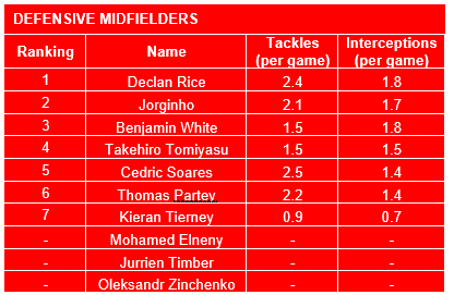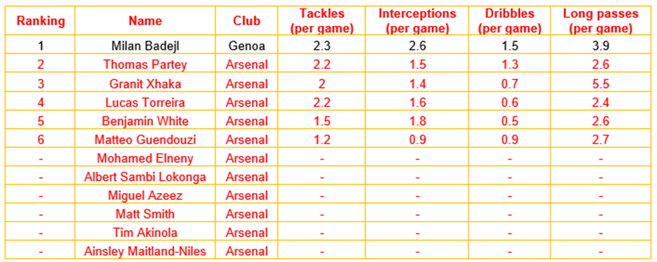 In terms of the central defensive midfield position, it’s unfair to judge Maitland-Niles, Akinola, Smith, Azeez, Lokonga and Elneny’s suitability, as all six players have insufficient professional experience in the reviewed leagues to appropriately assess their performances.