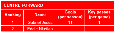 Centre Forward (KPIs: 10+ Goals, 1+ Dribbles, 3+ Successful aerial duels)