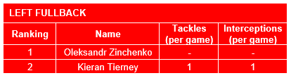 Left Fullbacks (KPIs: 2+ Tackles, 2+ Interceptions)
