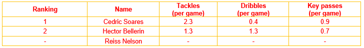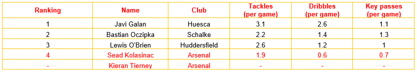 Regarding Arsenal’s other current left wingback options, Kolasinac is solid in terms of tackles per match, but is comparatively inferior in terms of dribbles and key passes per game.