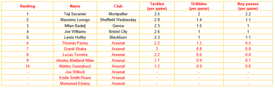 In terms of the club’s contracted central midfield options, it’s unfair to judge the suitability of Elneny, Lokonga and Willock, as none of those players have had sufficient professional experience in any of the examined leagues, to appropriately assess their performances.