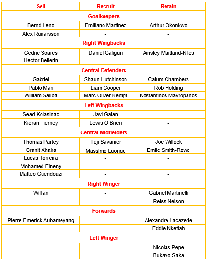 While the above squad changes would be ideal, the club could afford to retain Maitland Niles (right wingback), Holding, Chambers, White, and Mavropanos (central defenders), Xhaka (central midfield), Willian, Pepe, Smith-Rowe, Nelson, Saka (attacking midfield) and Lacazette (centre forward), with the recruitment priorities being: