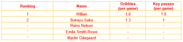 Regarding Arsenal’s other right wing option, Willian’s dribbles and key passes per game are solid, but his goals per season is poor.