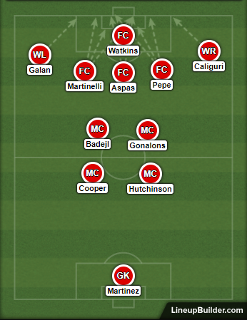 Based on the above analytical comparison, and Arsenal’s aforementioned tactical basis and minimum required KPIs, the 11 players which it is suggested should comprise Arsenal’s starting 11 in a high pressing, wide overloading 3-4-2-1 formation would appear to be as follows:
